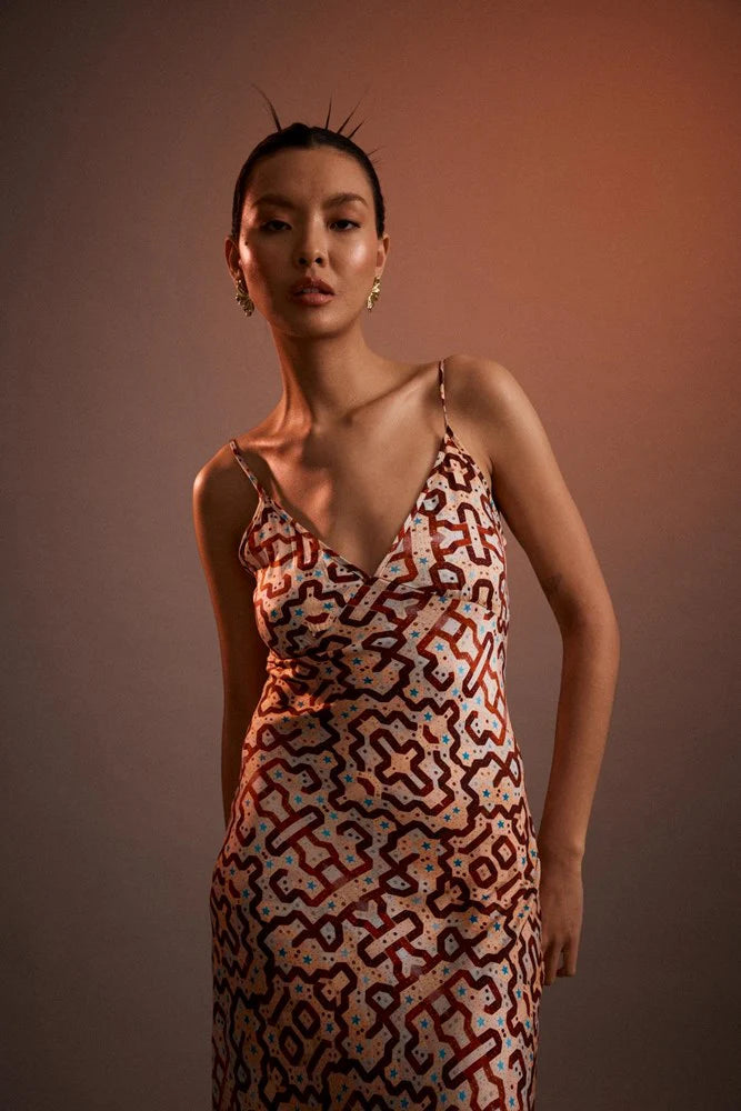 A dress that moves like a mirage. The Calliope Triangle Slip Dress skims the body with a fluid, sultry fit, while its intricate, earthy print feels like an ancient map to somewhere magical.