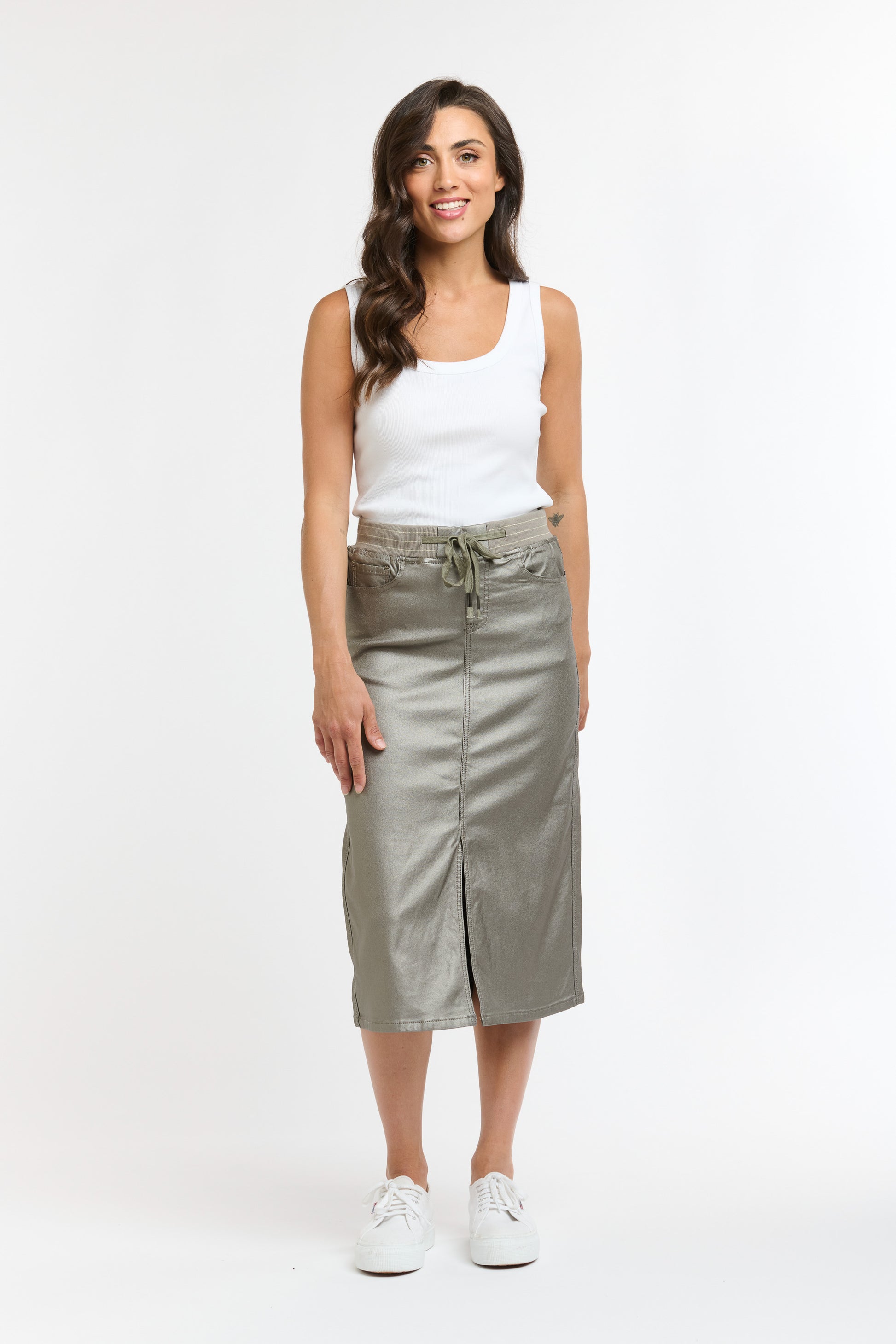 The Hugo Skirt in Gunmetal is the perfect blend of sporty and stylish. Pair it with sneakers or boots for a casual look, or layer it with knits or tees and a jacket for a more put-together vibe. The drawstring tie waist adds both comfort and a touch of chic. And let's not forget about the stunning gunmetal color that will make you stand out in any crowd. Get ready to turn heads in this versatile and eye-catching skirt!