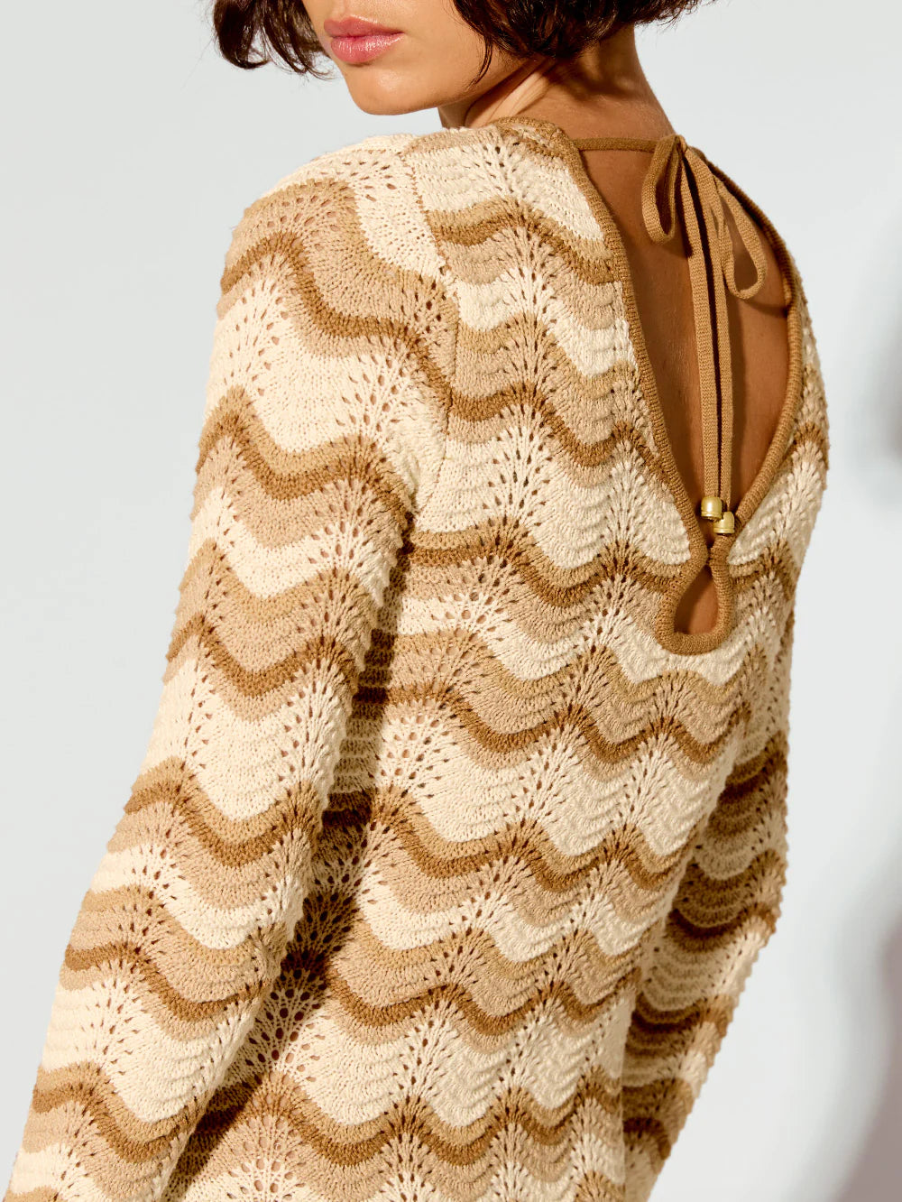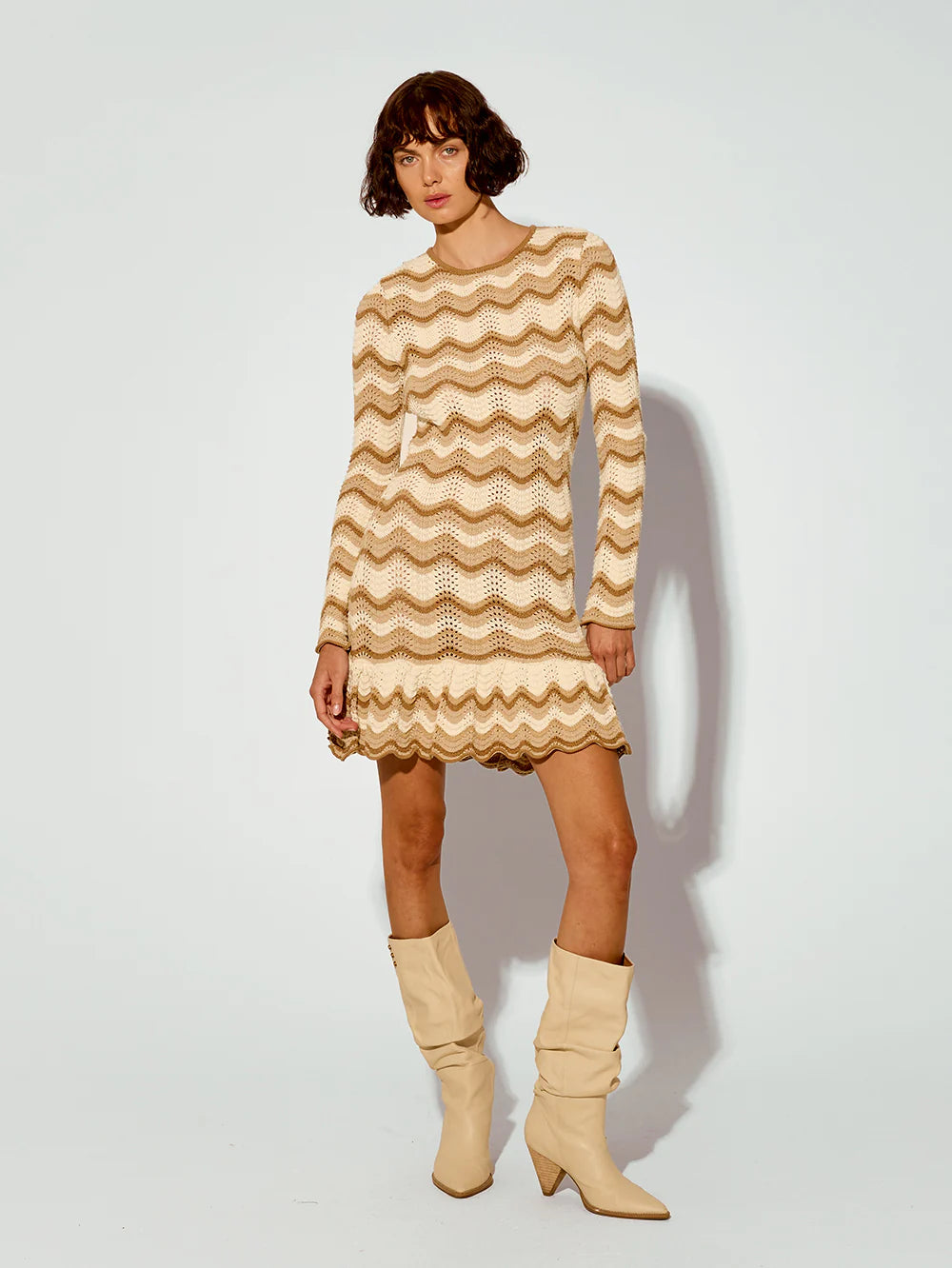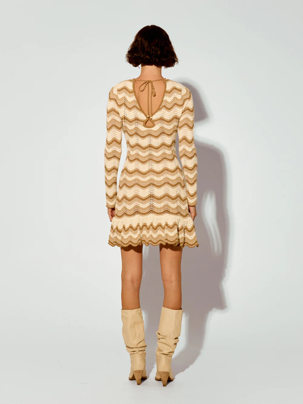 The Kassiani Knit Mini Dress in a brown and ivory wave design features straight fitted long sleeves, a back cutout feature, complete with a frill hem and scalloped edging.