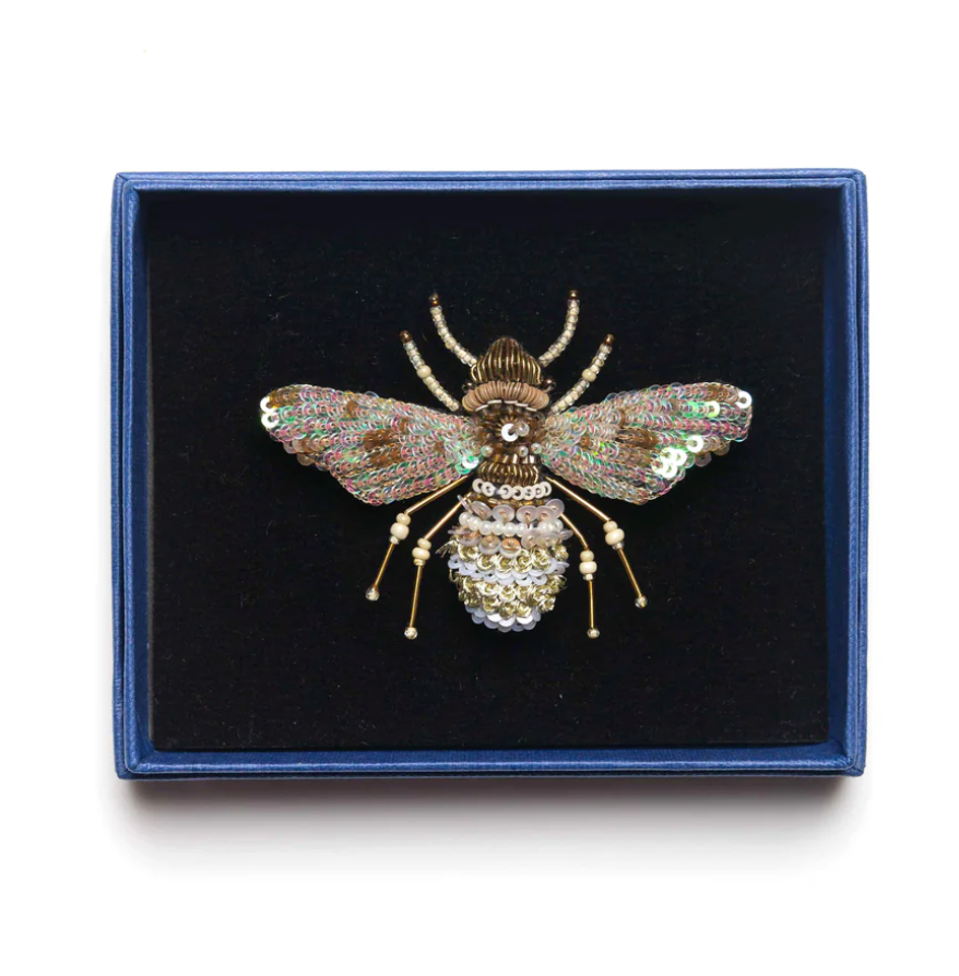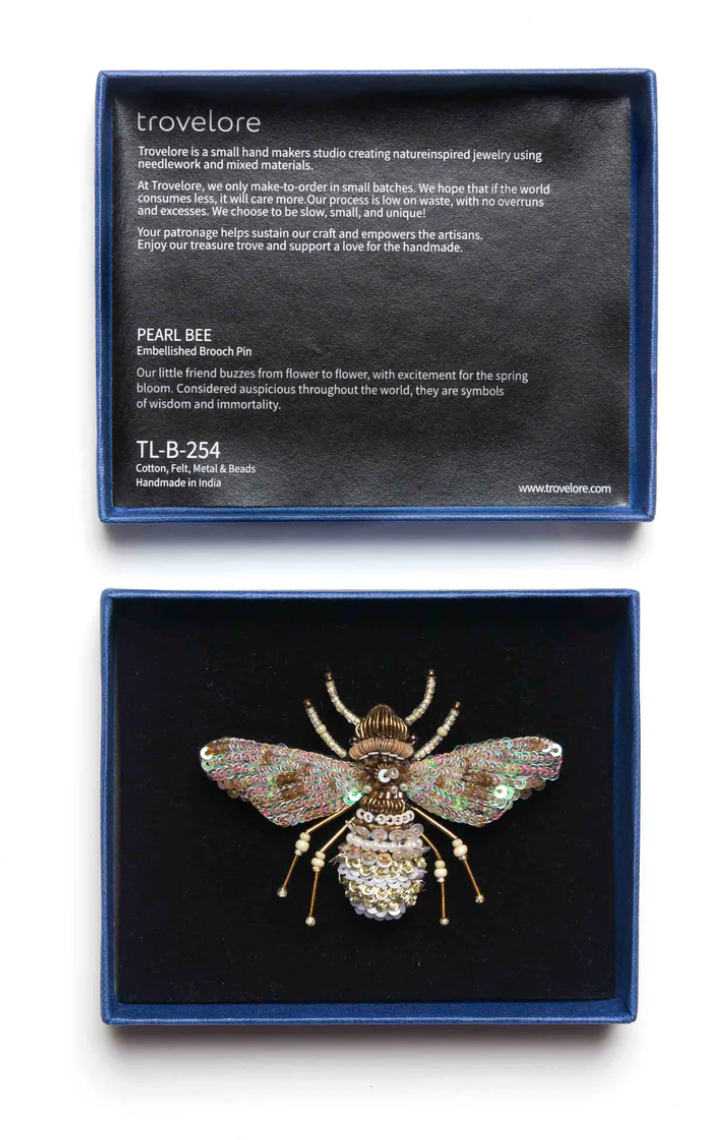 Introducing the Pearl Bee brooch from Trovelore! Hand beaded and embroidered, this little piece of art adds a touch of whimsy to any outfit. Wear it on your lapel, collar, scarf, or even as a cuff link. A must-have for any fashion enthusiast.