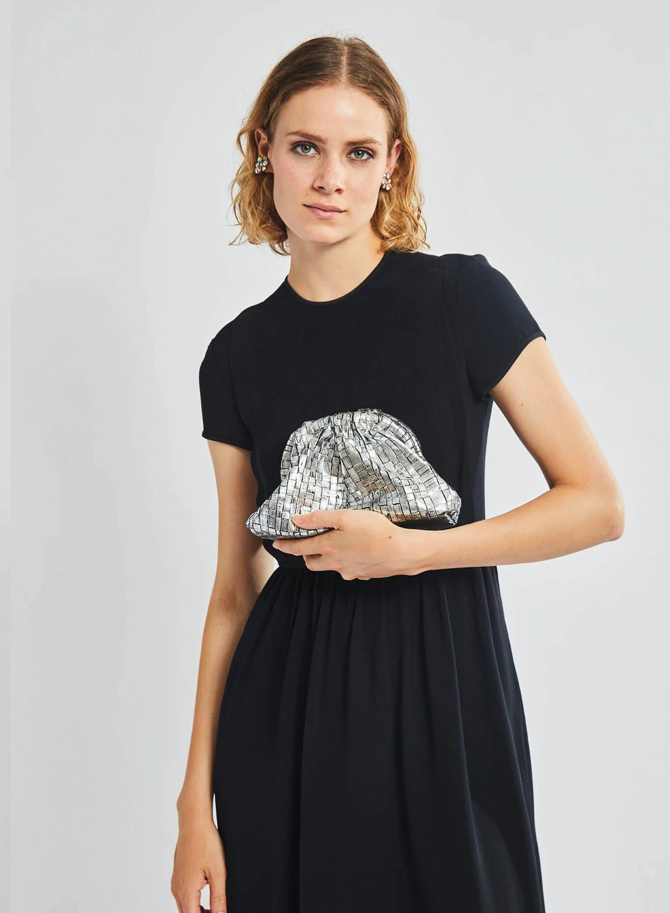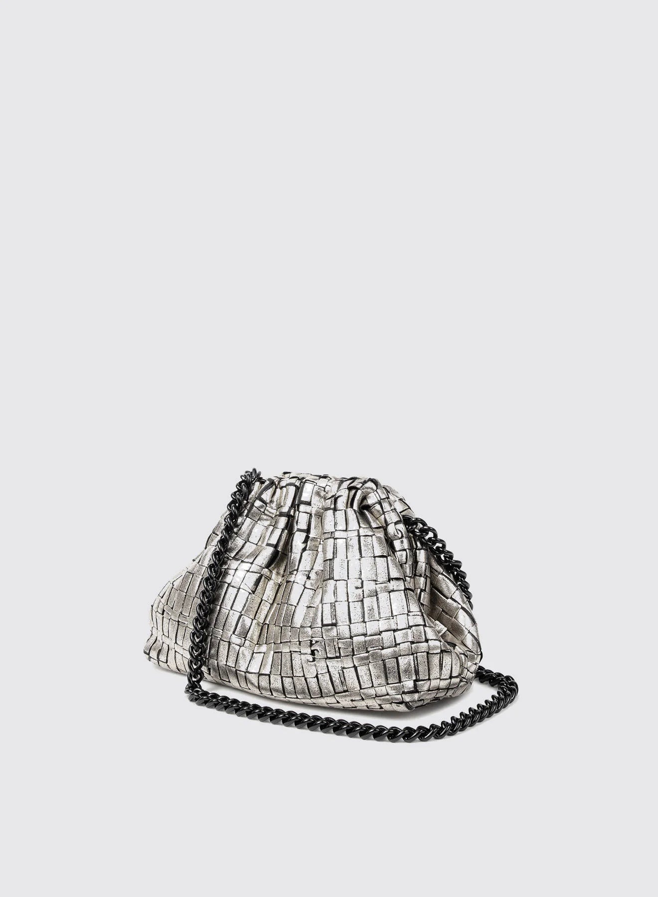 Small women's clutch in handwoven ribbon fabric on ancient looms. This model constitutes the Maria La Rosa icon bag, perfect for all seasons, the emblem of a new metropolitan elegance, which ensures capacity and functionality. The iconic woven texture, in this new version, is covered with a foil that shines with gold, turquoise, or emerald reflections. It comes with a matching chain to also wear it over the shoulder.