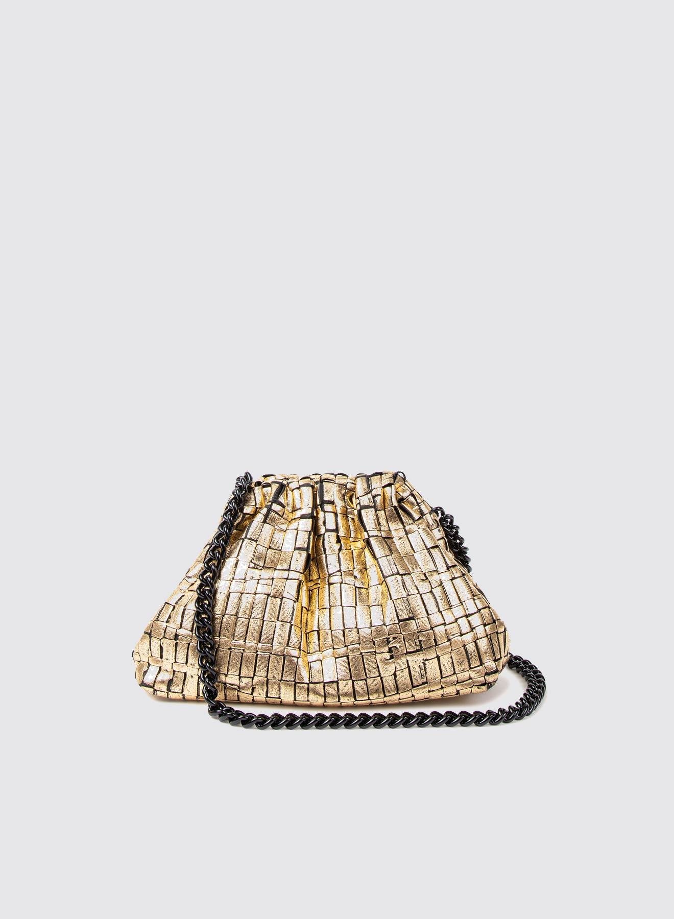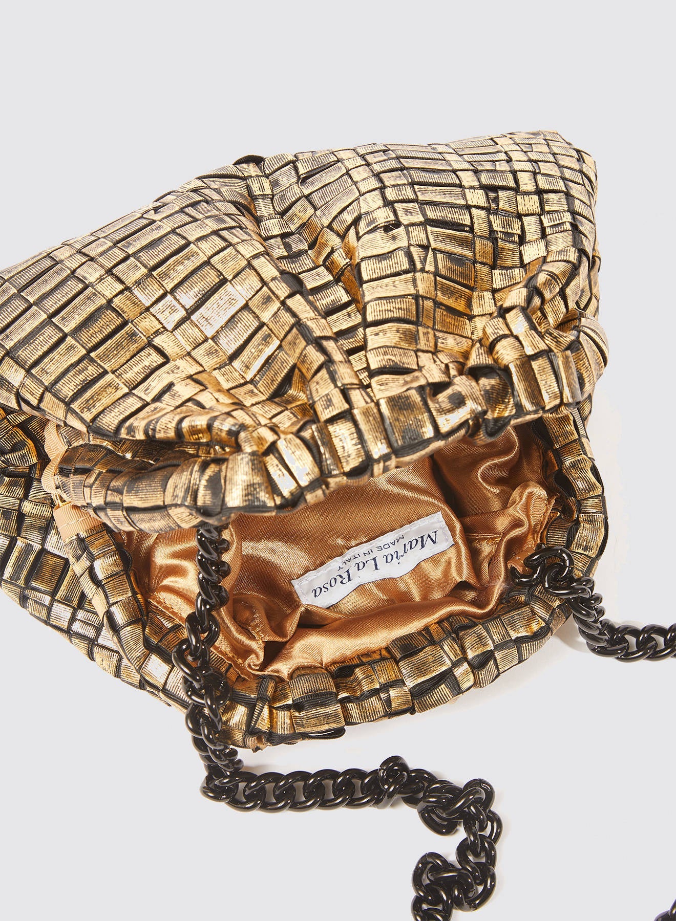 Small women's clutch in handwoven ribbon fabric on ancient looms. This model constitutes the Maria La Rosa icon bag, perfect for all seasons, the emblem of a new metropolitan elegance, which ensures capacity and functionality. The iconic woven texture, in this new version, is covered with a foil that shines with gold, turquoise, or emerald reflections. It comes with a matching chain to also wear it over the shoulder.