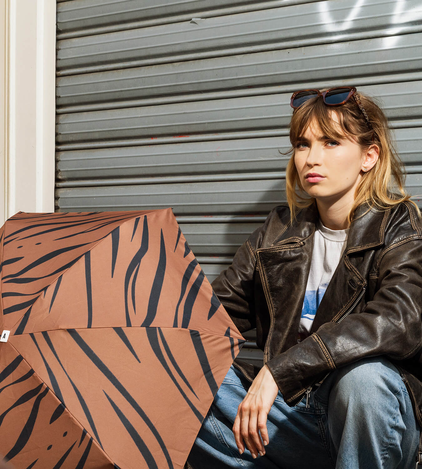 The stunning French Anatole umbrella in the new tiger print. The sides of this compact umbrella are joined together to create the spontaneity and boldness we’ve come to expect from this type of pattern. Take the risk of looking more unapproachable than you are!